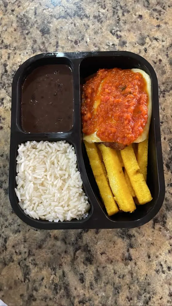 Todos com o acompanhamento da casa: arroz, feijão, fritas, alface e tomate.